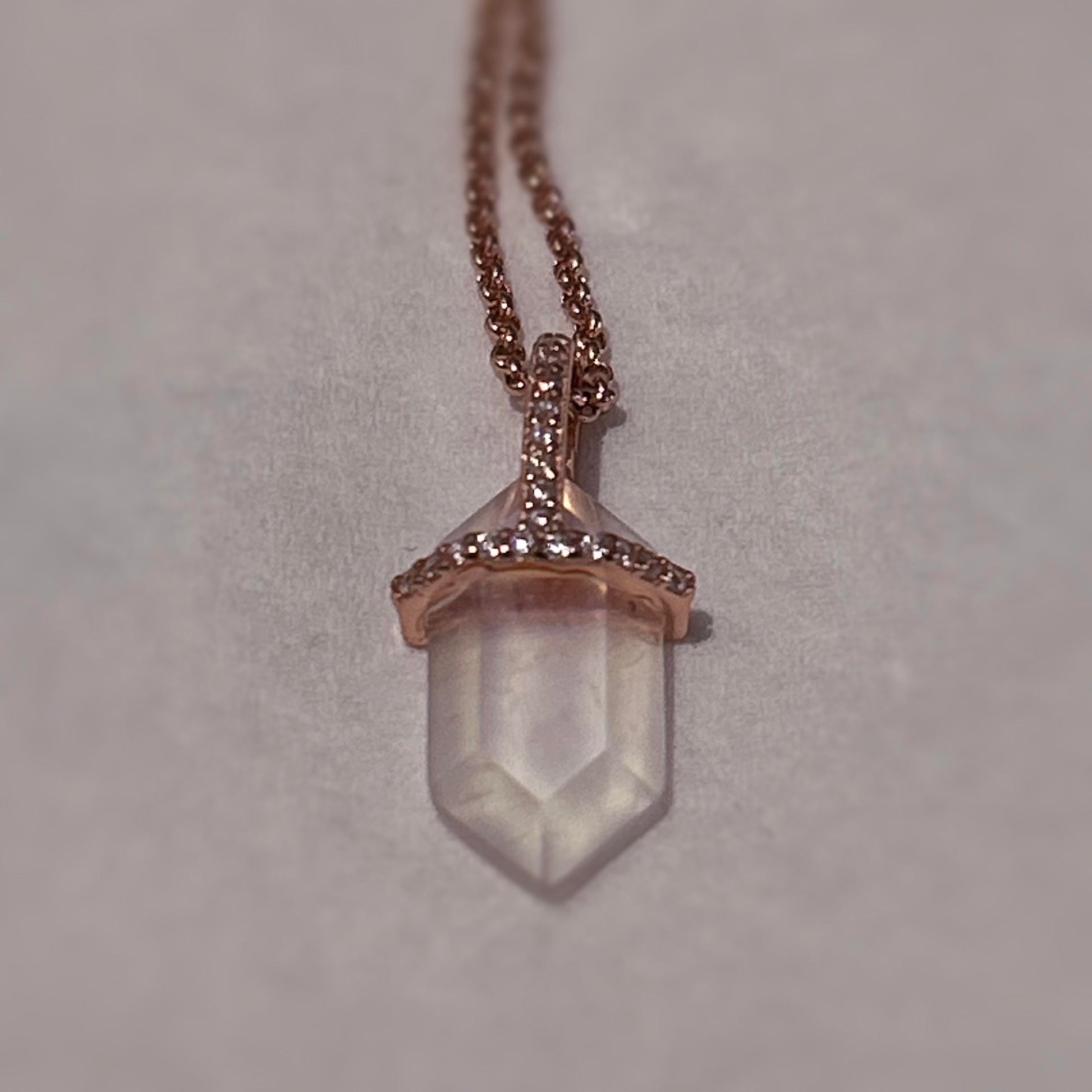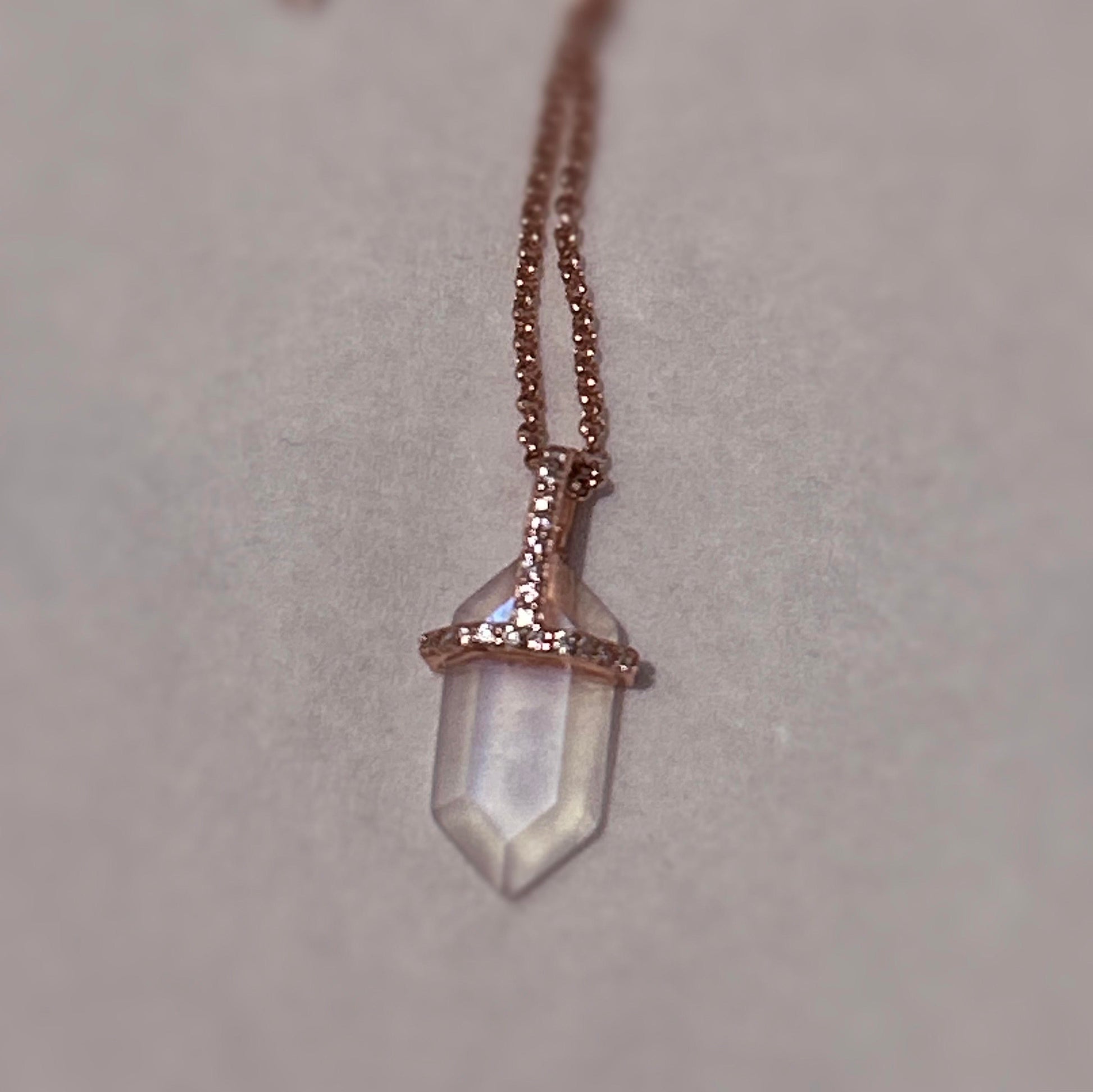 This pendant features a Rainbow Moonstone and White Zirconia Stone, set in 14kt Rose Gold with a 925-sterling silver base. The included 50cm Rose Gold Chain can be swapped out for another. Moonstone is known for its strong connection to the inner goddess moon and its cycles, believed to boost intuition, creativity, and feminine energies while also promoting emotional healing, inner growth, and spiritual balance.