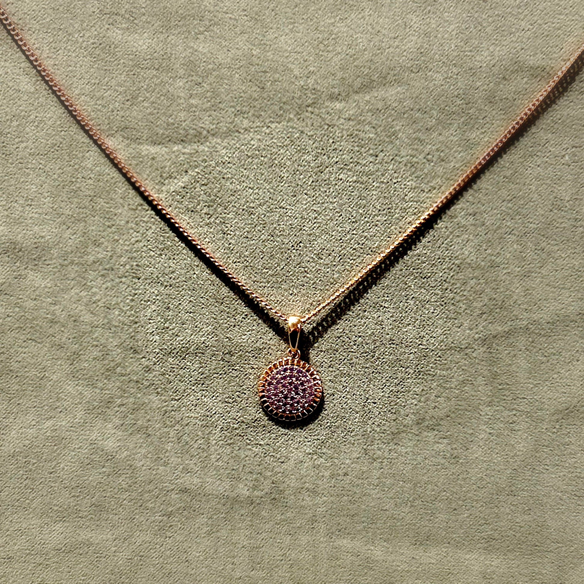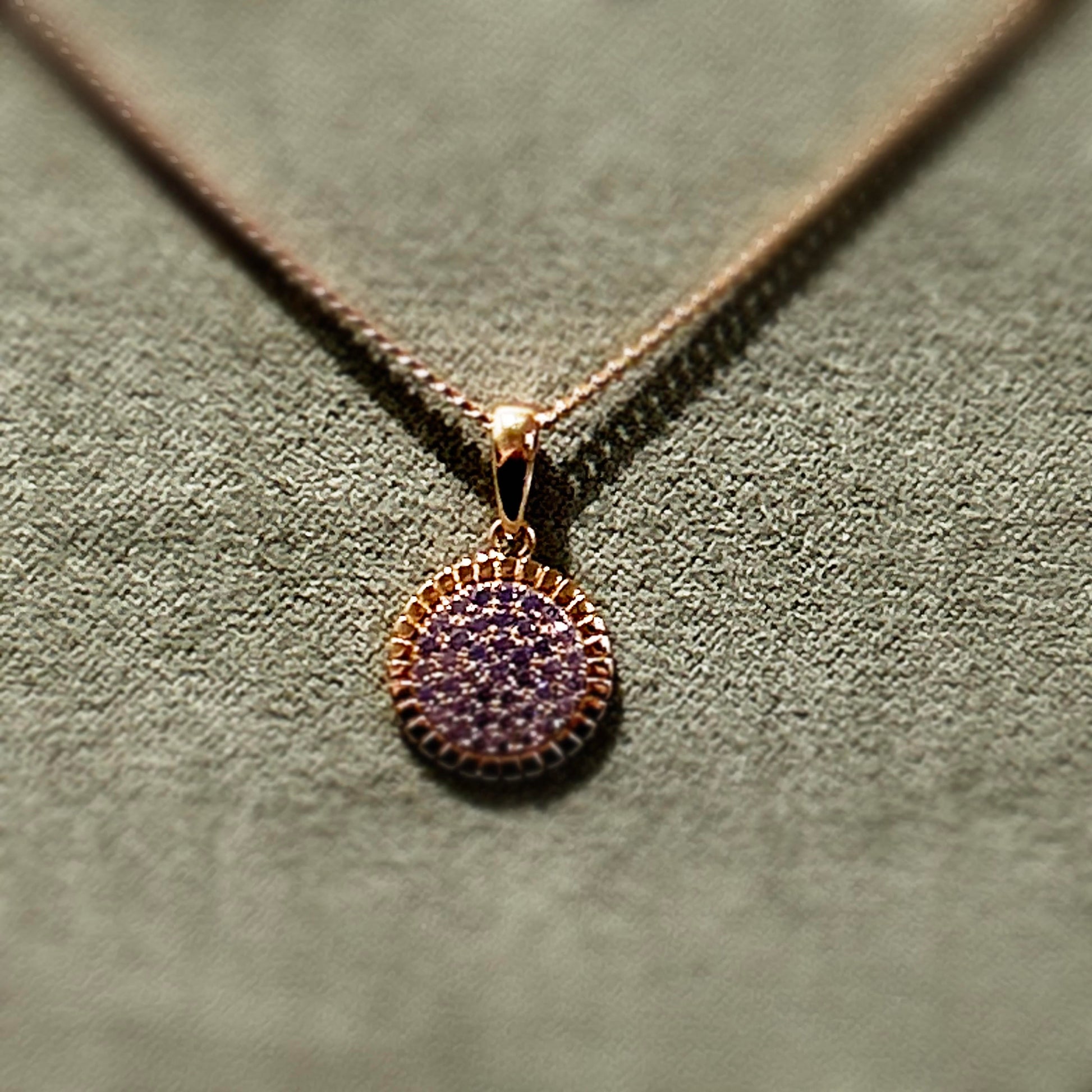 Enhance your elegance with Olivia, featuring Lavender Amethyst stones set in sleek rose gold. Made with 14kt Rose Gold and 925-sterling silver base, this pendant is accompanied by a 60cm Cuban chain for versatility. A perfect addition to any outfit.